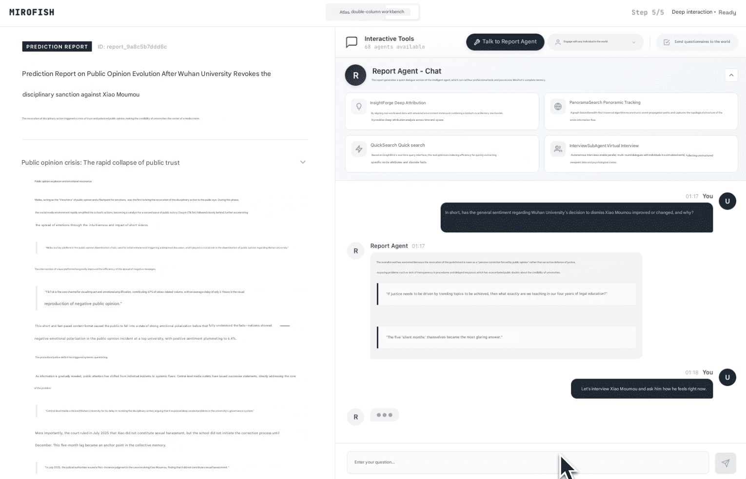 5. Go Deeper Unlike most tools that hand you a PDF and call it done, MiroFish lets you keep going. You can chat directly with any simulated agent, probe the ReportAgent for alternative interpretations, or inject new variables and re-run entire scenarios. What if the CEO made a different statement? What if the policy rolled out a month later? You can keep testing it.