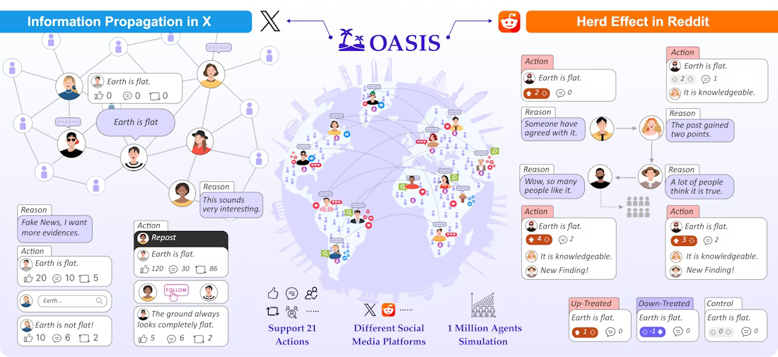 3. Run the Simulation The agents are turned loose. They discuss, argue, persuade, and change their minds. The system runs parallel simulations, two independent digital worlds at once, and tracks how opinions evolve across time. This is where the "swarm intelligence" magic happens: complex, realistic-looking social dynamics emerge from thousands of individual interactions. The engine powering all of this is OASIS by CAMEL-AI. It can simulate up to one million agents simultaneously, and each agent behaves like a real social media user, they follow, comment, repost, like, mute, and search, just like you do.